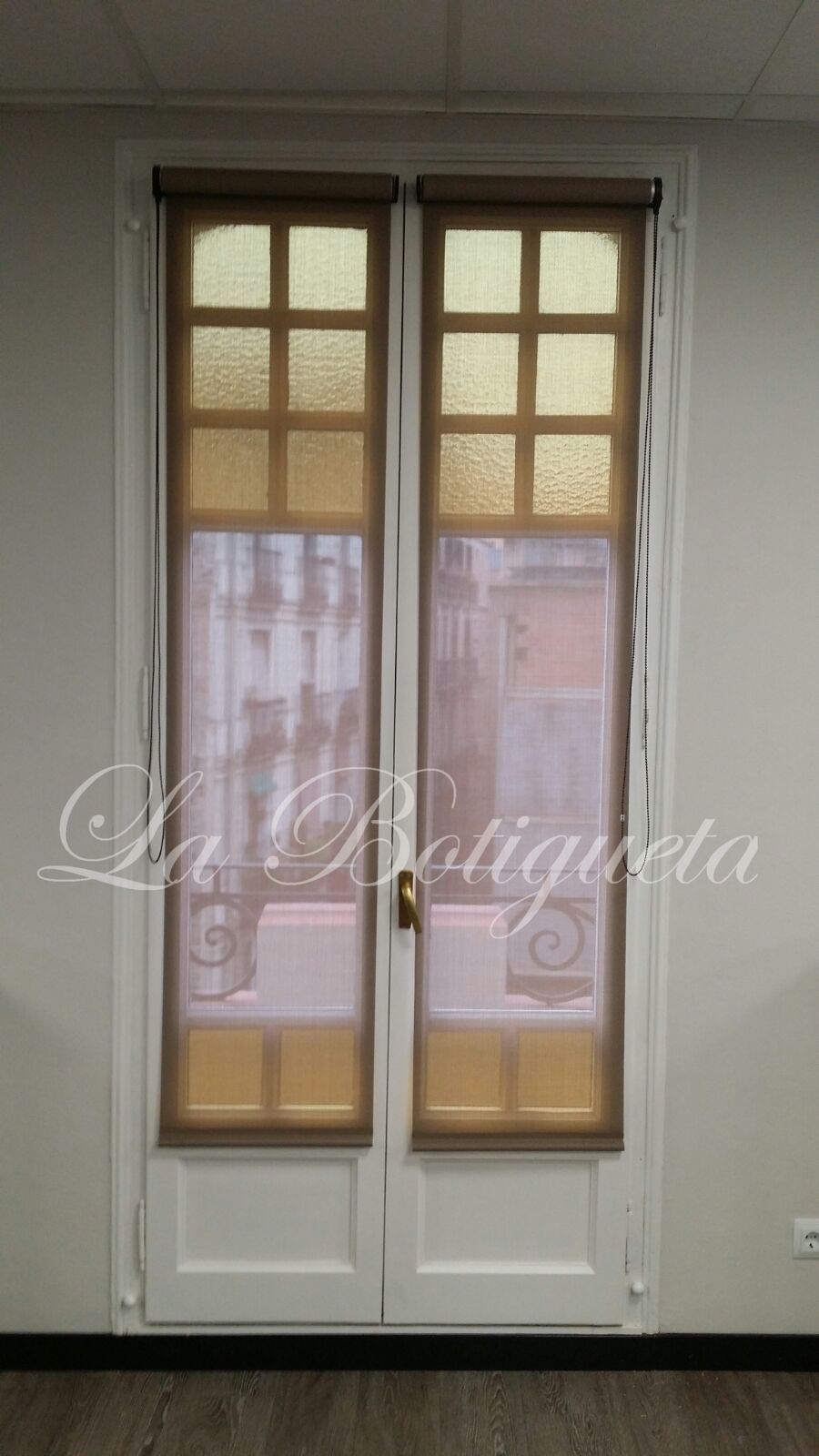 En una oficina en la Vía Laietana de Barcelona, con unos techos muy altos y un exceso de calor y sol, optamos por colocar enrollables de screen en las puertas con salida a la terraza. Estas se instalaron en el marco con el fin que pasaran lo más desapercibidas posible. De esta forma, podían hacer su cometido: proteger del calor y los reflejos sin tener mucho protagonismo. Nos encontramos que al abrir las puertas los mecanismos chocaban con el marco y se solucionó colocando unos pomos de puerta de porcelana blancos haciendo juego con las puertas.